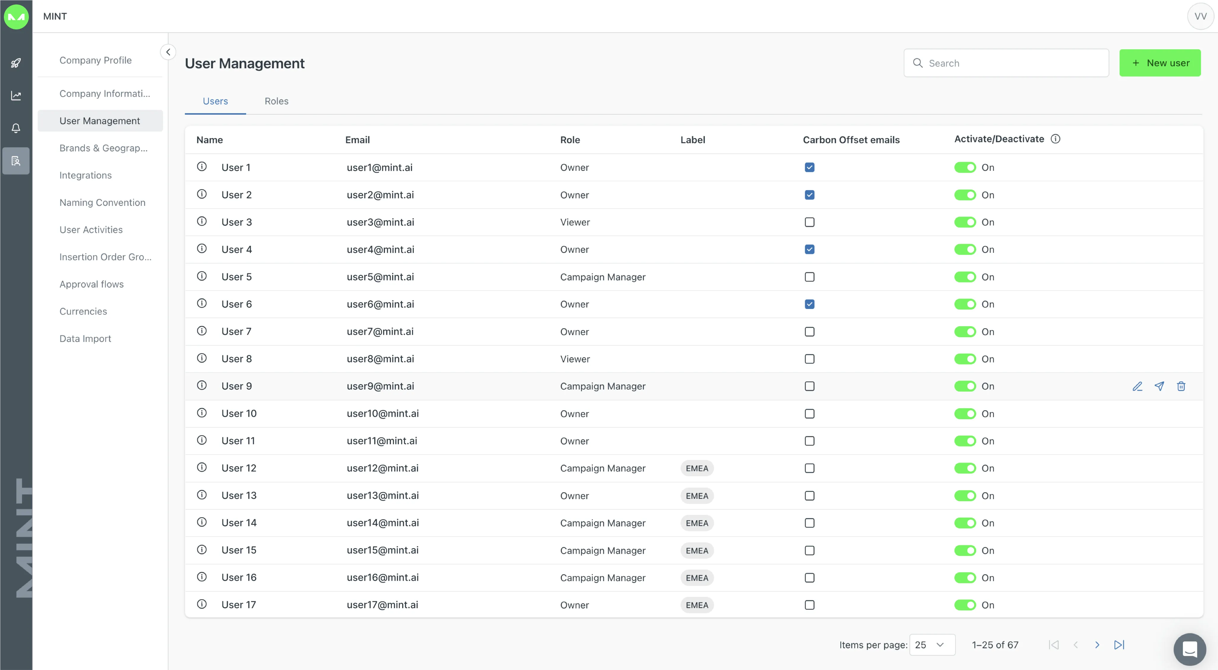 The User Management area contains an overview of all Users included in a company and the possibility to create or edit existing Users. There is also the Roles section where roles can be created and permissions can be defined for the specific User.