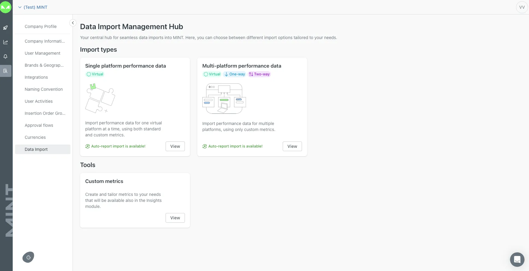 The Data Import Hub allows you to easily map and import data from any Excel file directly into MINT, making it ready for analysis in the Insight module. Additionally, the hub includes other features to streamline file management such as: Past Imports, Templates, and Custom Metrics for Single-Platform. The hub also contains a Glossary, specifically designed for the Multi-Platform.