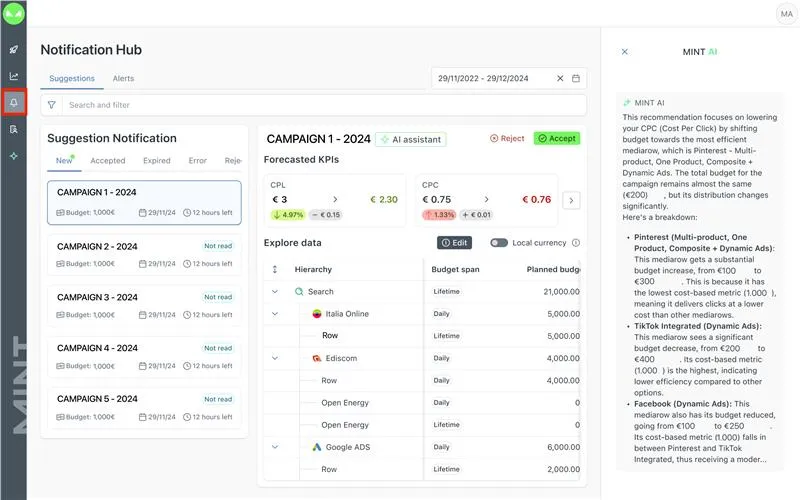 The Suggestions Engine provides you with recommendations about how to adjust your campaigns for an optimized performance. This feature is available within the Notifications area of MINT found when clicking on the “Bell” icon on the left-side menu bar.