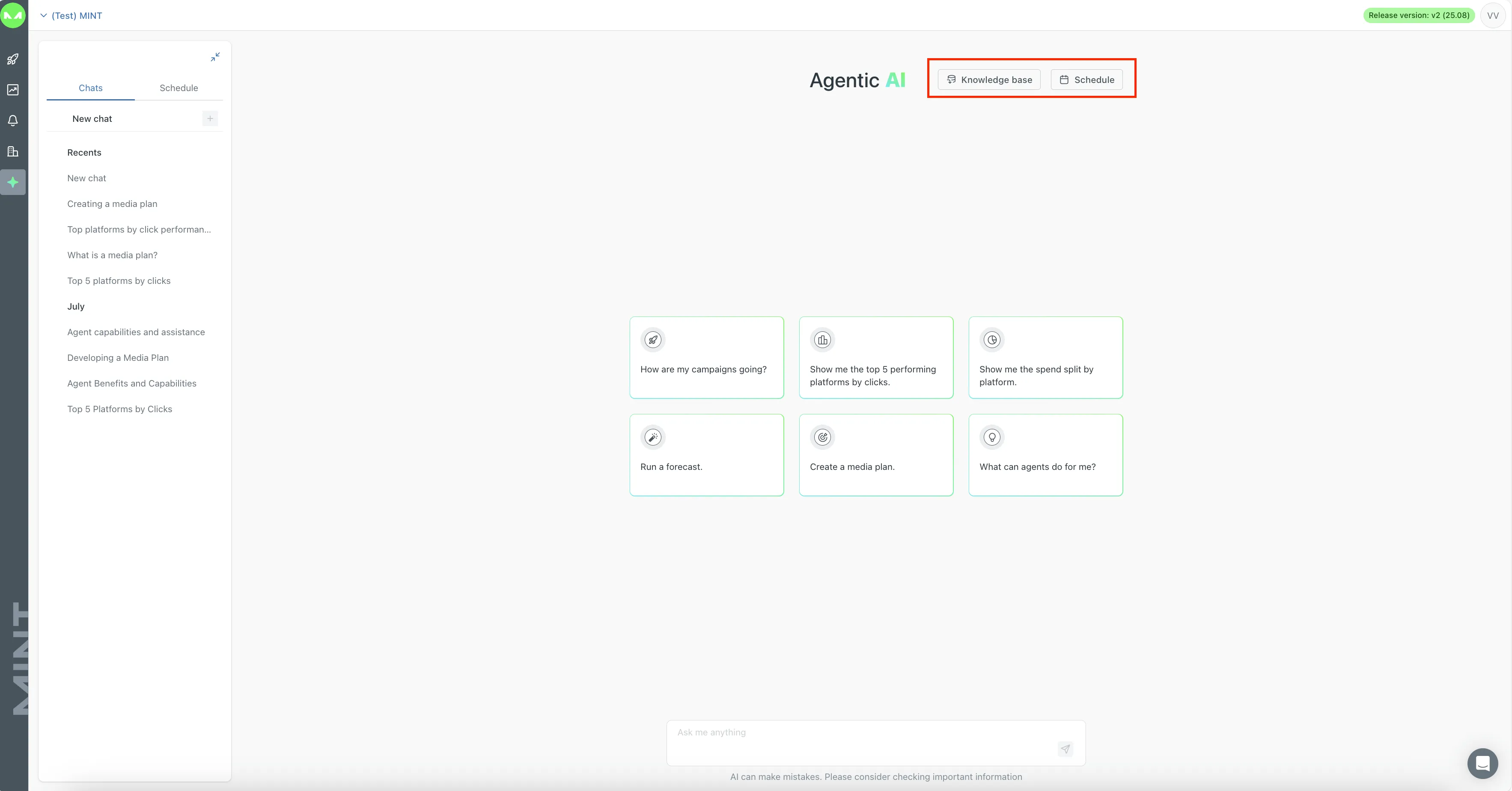 The MINT AI Agent Hub is a tool designed to enhance your productivity by streamlining daily tasks. Featuring six specialized agents—Planner, Strategist, Project Manager, Supervisor, Data Analyst, and Reporting Specialist—this module offers tailored support for your needs. Easily accessible from the My Campaign page, the AI Hub is currently in beta, ensuring continuous updates for optimal performance. This powerful tool can transform your workflow and improve campaign management.